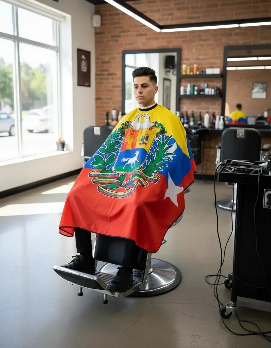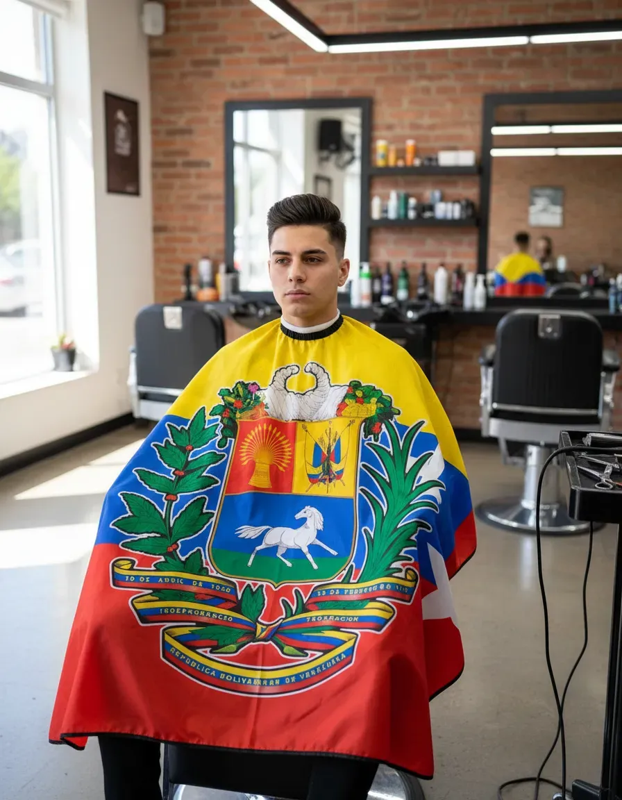 Capa de barbero profesional ideal para peluquerías y barberías modernas. Su diseño llamativo con el clásico poste de barbería y alas aporta un toque único y profesional al ambiente.